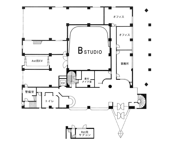 | 付帯設備(両スタジオ共通) | メイクルーム、スポンサールーム、リハーサルルーム、控室3部屋 駐車場、機材搬入用エレベーター ※こちらのページでご確認いただけます |
