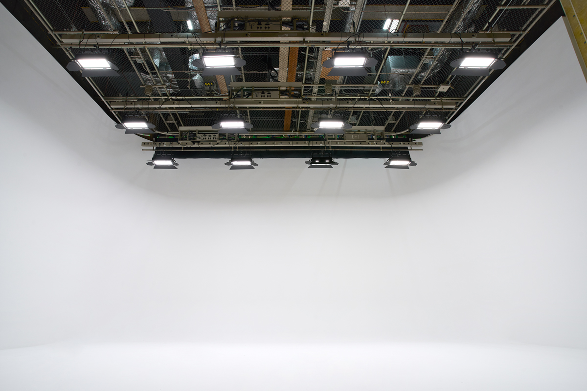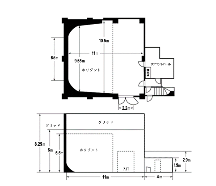 | 実効寸法 | サイズ:奥行11m × 幅10.5m(中央)× 高さ5.5m(ホリゾント丈) ホリゾント:三面アールホリゾント(壁・床接点 R形状)、面積 108.35㎡、ホワイトグレー 床面:ホワイトグレー |
